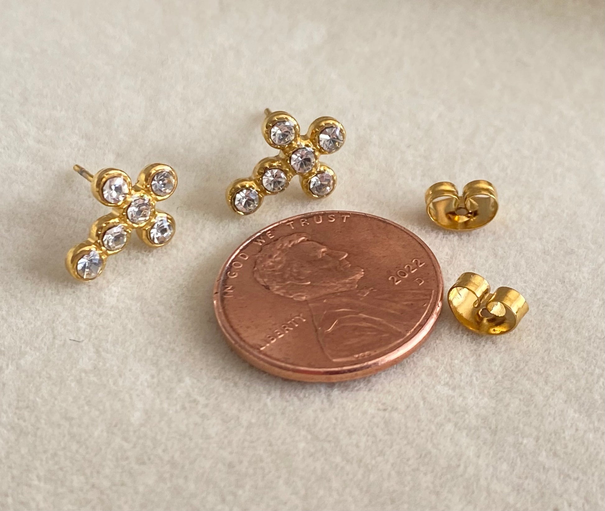 A timeless symbol of faith and elegance. These 18k gold-plated cross studs feature petite CZ stones that shimmer beautifully in the light — perfect for everyday wear or a thoughtful gift.
